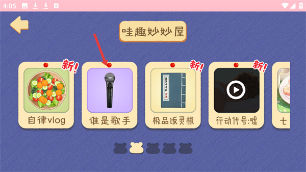 1、進入【哇趣妙妙屋】界面后,可看到多個功能模塊,其中帶麥克風標識的【誰是歌手】為核心玩法入口,點擊即可進入該玩法的互動流程。