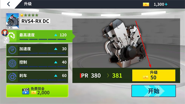 1、進入升級頁面查看摩托屬性,點擊升級按鈕消耗金幣提升部件等級,增強最高速度等性能參數,提升摩托的PR值。