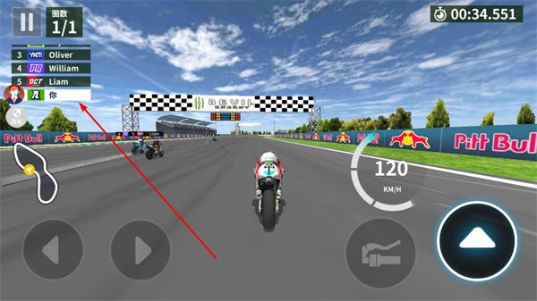 4、進入比賽操控摩托,觀察當前名次及其他選手位置,調整行駛方向向終點沖刺,爭取超越對手提升最終排名。