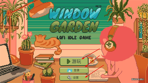 1、進入窗臺花園主界面后,優先點擊游玩開啟游戲,也可先完成登錄操作同步游戲進度,通過設置選項調整音效、畫面等參數,優化整體游玩體驗。