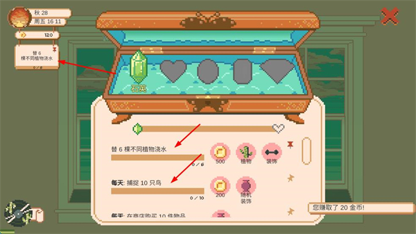 2、查看任務寶箱界面的各項任務要求,重點完成替6棵不同植物澆水、每天捕捉10只鳥等任務,完成后可領取金幣、植物等獎勵,助力花園建設進程。