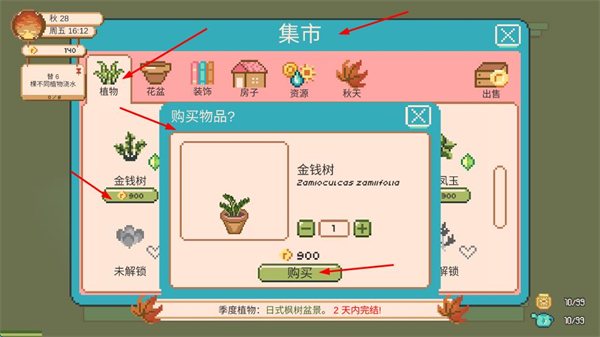 4、進入集市界面選擇植物分類,找到金錢樹等心儀植株,確認金幣數量滿足購買條件,如金錢樹需900金幣后點擊購買,豐富花園內的植物品類。