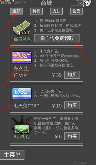 1、點擊進入游戲商城全部類目界面,每日禮包可通過觀看廣告領取500K鼠鼠幣,免廣玩家可直接領取,也可按需選購永久免廣VIP等特權類商品提升游玩體驗。