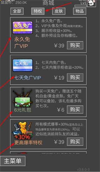 2、切換至商城特權分類界面,可選擇永久免廣、七天免廣、爆率提升等不同特權,依據自身游玩需求,消耗對應金額購買,以此增強游戲收益與功能體驗。
