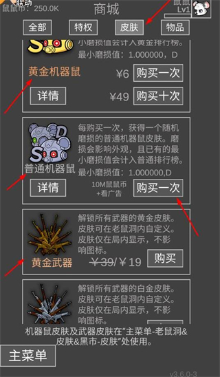 3、打開商城皮膚分類界面,可選購黃金機器鼠、普通機器鼠等角色皮膚,黃金武器禮包能解鎖全武器黃金外觀,消耗金幣或現金即可完成購買,自定義角色形象。