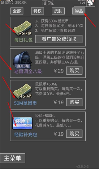4、進入商城物品分類界面,每日禮包領取規則同全部分類一致,還可選購老鼠洞全八級、50M鼠鼠幣、經驗補充包等道具,消耗對應金額購買助力資源與等級提升。