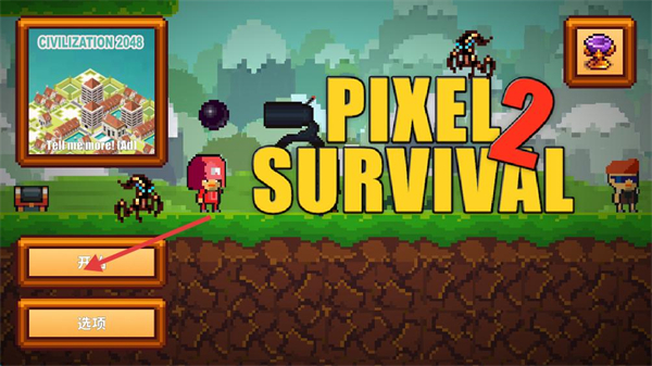 1、點擊開始進入游戲,這是一款像素風生存冒險游戲,核心玩法是收集資源、建造設施,在像素世界中生存發展。