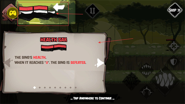 1、界面中的紅色方塊代表恐龍生命值,當數值降為0時恐龍會被擊敗,戰斗中需關注自身與敵方的生命值狀態。