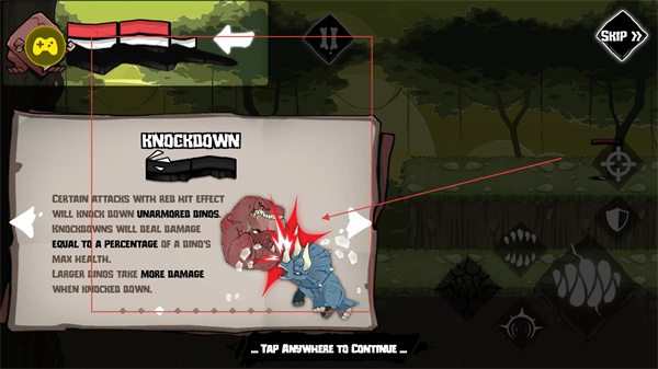 2、帶有紅色特效的攻擊可擊倒無裝甲恐龍,體型越大的恐龍被擊倒時承受的傷害越高,可優先用此類攻擊針對大型目標。
