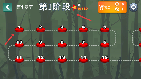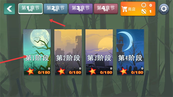 3、進入第1章節第1階段的關卡列表,選擇第1關即可開始挑戰,每個關卡需通過射擊消滅所有僵尸,獲取星星提升階段進度。