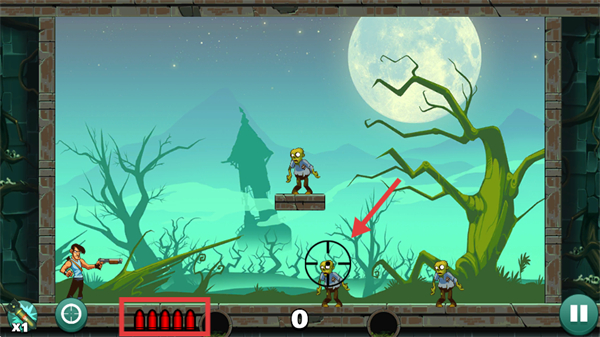 4、在關卡中觀察僵尸位置與場景結構,瞄準合適角度發射子彈,消滅所有僵尸即可通關,消耗的子彈數會影響評分。
