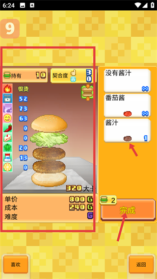 3、進入食品制作界面,選擇食材搭配出漢堡結構,添加醬料等配料調整口味,確認食材組合后點擊完成按鈕,即可完成新食品的制作流程。