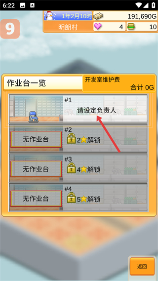 2、進入開發室的作業臺頁面,先為作業臺設定負責人,后續作業臺需滿足對應星級條件才能解鎖,完成負責人設定后即可開啟作業臺的使用。