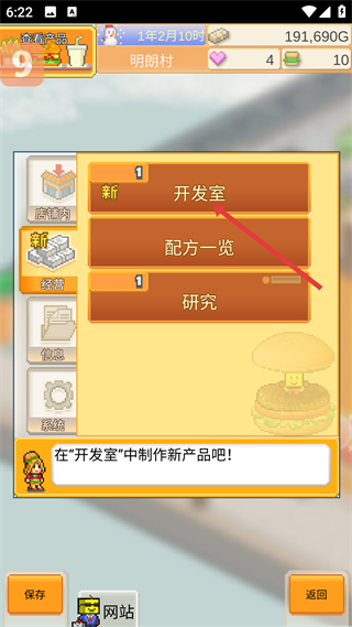 1、進入游戲主界面,找到開發室選項并點擊,即可進入新食品制作的準備頁面,這里可開展新品研發、查看配方或進行研究操作。