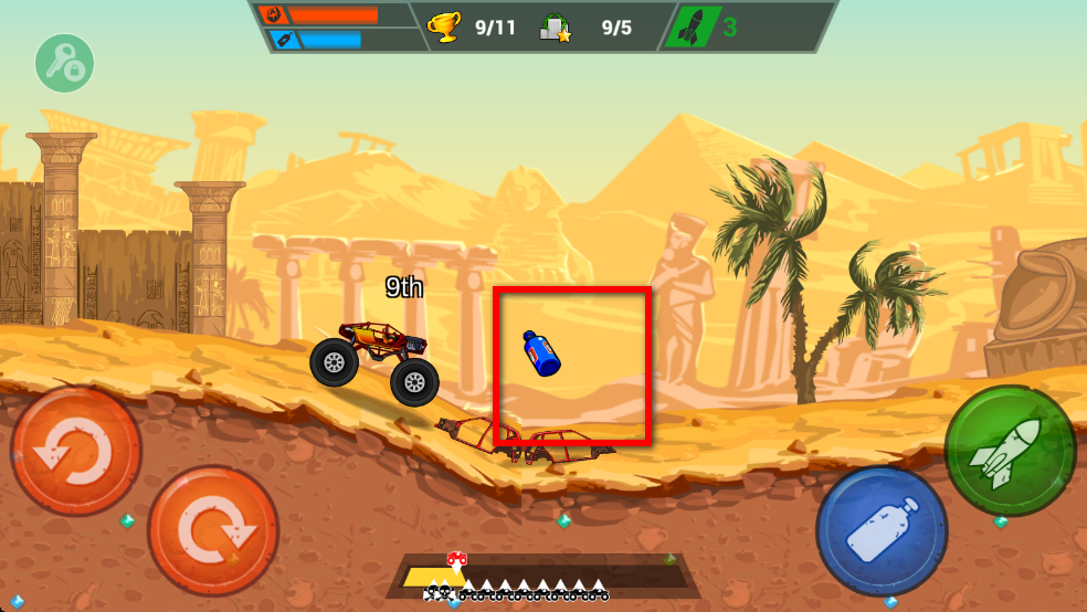 1、在沙漠賽道駕駛賽車前進,途中可拾取藍色道具補充資源,注意避開賽道破損區域,保持賽車穩定行駛,逐步提升排名推進關卡。