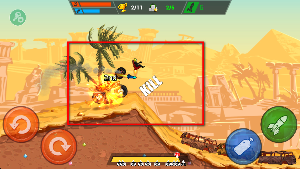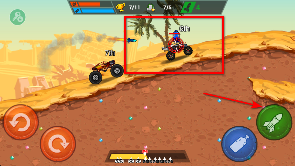2、使用火箭道具攻擊前方排名靠前的賽車,瞄準對手位置釋放道具,命中后可淘汰對手提升自身名次,同時注意自身賽車的行駛狀態。