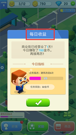 4、每日可查看收益界面,了解當日賺取的金幣數量,同時完成每日任務可獲得額外獎勵,點擊確認按鈕領取獎勵,助力商業街進一步發展。