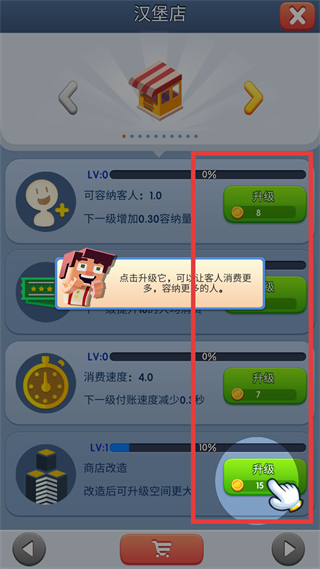 3、進入已建成商店的升級界面,可對容納客人數量、消費速度、商店改造等屬性進行升級,消耗對應金幣點擊升級按鈕,即可提升商店經營效率。