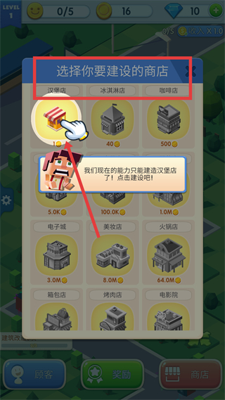 2、購買地塊后進入商店選擇界面,可看到漢堡店、冰淇淋店等不同類型的商店選項,根據當前金幣數量選擇可建設的商店,點擊即可開始建設。