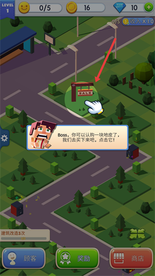 1、首先根據提示點擊指定地塊,即可購買該區域用于建設商店,初始擁有少量金幣與鉆石,后續可通過經營獲取更多資源。