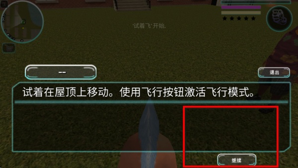 2、查看界面提示,按指引點擊繼續按鈕,開啟試飛環節,激活飛行模式后,嘗試在屋頂區域移動,熟悉飛行操作的方式和節奏。