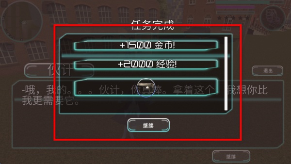 4、完成任務后會顯示結算界面,可獲得金幣和經驗獎勵,點擊繼續按鈕關閉界面,繼續參與后續的沙盒互動或任務挑戰。
