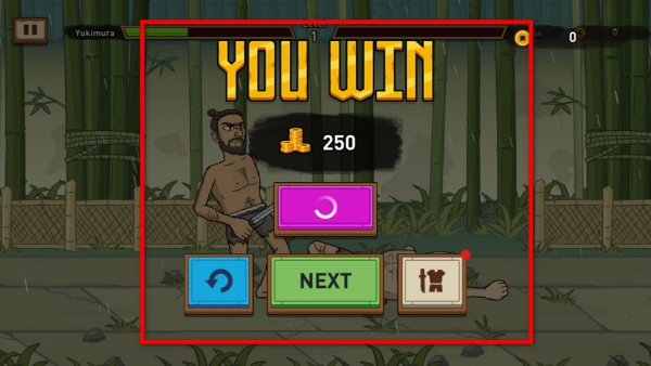 4、勝利后會顯示獎勵界面,可獲得金幣,點擊繼續按鈕進入下一關,繼續參與武士對決,積累更多獎勵提升角色實力。