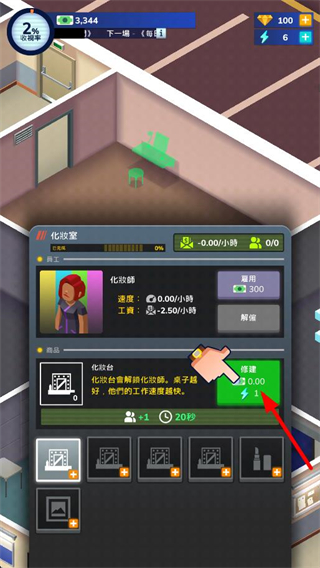 4、找到化妝臺道具,點擊修建按鈕,為化妝室添置設備,以此來解鎖化妝師并提升其工作速度。