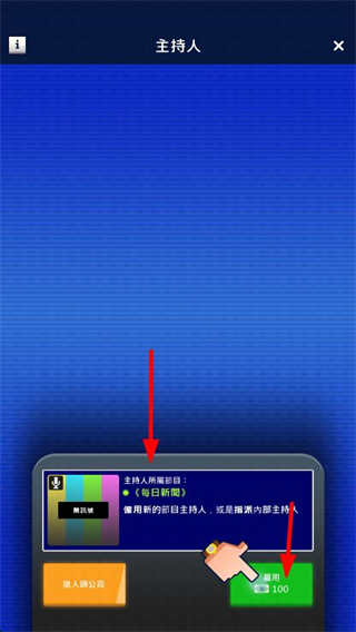 2、進入主持人界面,查看主持人所屬節目信息,點擊雇用按鈕花費對應資源,為節目聘用新的主持人來推進節目制作。