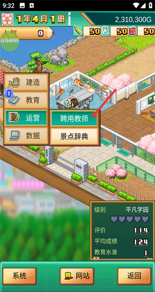 2、在學院場景中點擊運營選項,打開運營相關的功能界面,從中選擇聘用教師的選項,來為學院配備教學人員。