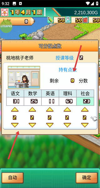 4、提升教師等級后,會獲得可分配點數,將這些點數分配到教師的不同學科能力上,增強教師的教學能力,之后點擊確定完成操作。