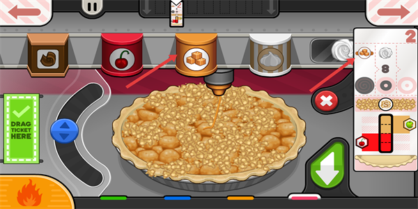 3、依據訂單對應的配料標識,選擇對應的配料容器,將該容器中的配料添加到派的上方,完成這一配料的添加操作步驟。