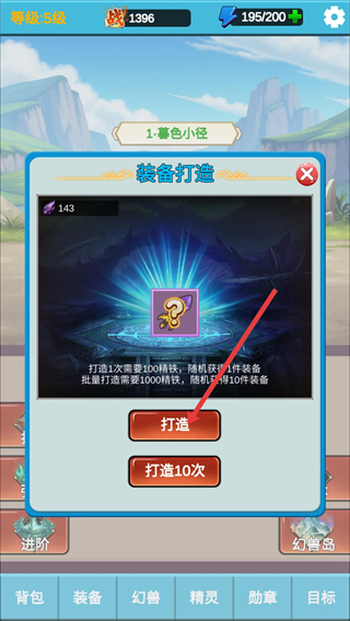 2、進入裝備打造界面,消耗100精鐵可打造1次裝備,批量打造需1000精鐵,通過打造獲取裝備來提升角色戰力。