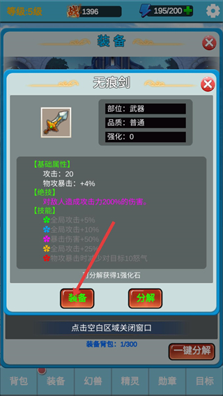4、查看獲得的無痕劍,可選擇裝備來提升角色攻擊屬性,也可分解獲取強化石,按需管理裝備資源。