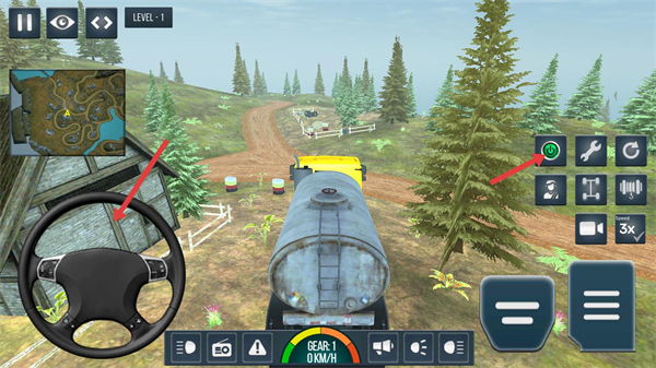 1、界面左側是方向盤操控車輛轉向,右側有功能按鈕,初始處于靜止狀態,點擊后即可行駛。