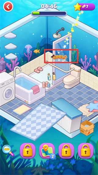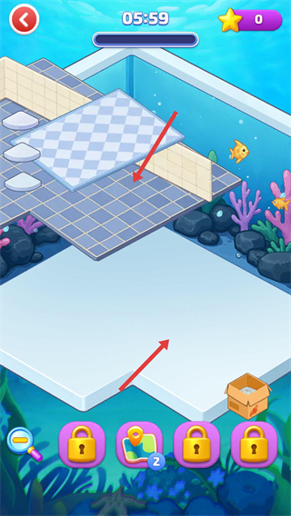2、進入關卡后場景為水下風格,需將物品移動至對應空位,先觀察場景中的可布置區域,合理規劃物品擺放順序。