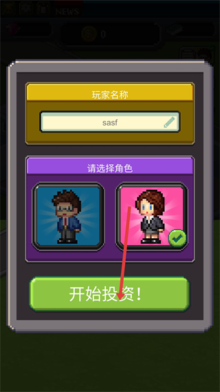 1、在初始界面設置玩家名稱后,選擇角色,點擊開始投資即可進入游戲,開啟模擬投資玩法。