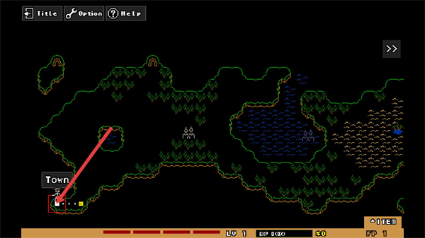 3、進入世界地圖后,初始位置為城鎮,可從這里出發探索草地、洞穴等場景,擊敗怪物推進關卡。