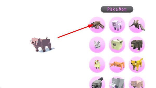 2、完成父方選擇后進入PickaMom界面,界面同樣呈現多個動物形象選項,挑選其中一個作為母方角色,完成雙親角色的選擇。