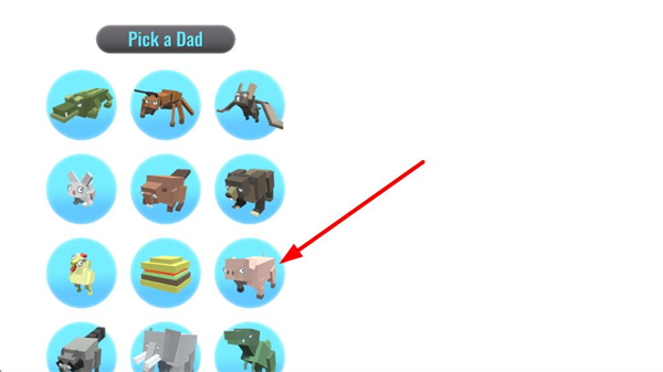 1、進入游戲先看到PickaDad界面,界面展示多個動物形象的選項,選擇其中一個作為父方角色,開啟角色組合的第一步。
