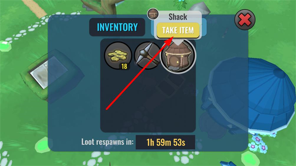 4、進入游戲主界面后打開INVENTORY,可查看已有物品,點擊TAKEITEM獲取Shack等道具,同時留意Lootrespawnsin的刷新時間。