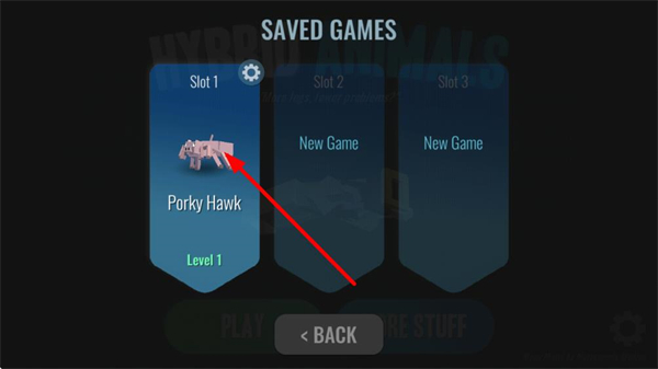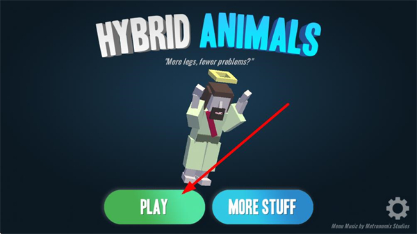 1、進入游戲主界面看到HYBRIDANIMALS標題及相關角色形象,點擊PLAY按鈕可進入游戲,MORESTUFF按鈕則提供額外功能選項。