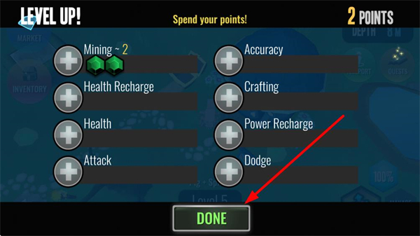 4、升級后進入LEVELUP界面,可分配點數到Mining、Health等屬性,完成分配后點擊DONE按鈕確認,提升角色對應能力。