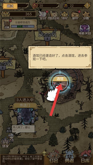 1、主界面中酒館建造完成后,點擊酒館入口可進入該系統,后續可通過酒館制作食物、提升勇者戰力。