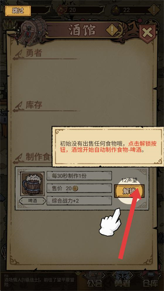 2、進入酒館后,初始無食物出售,點擊解鎖按鈕可開啟制作功能,每30秒制作1份食物,提升勇者綜合戰力。