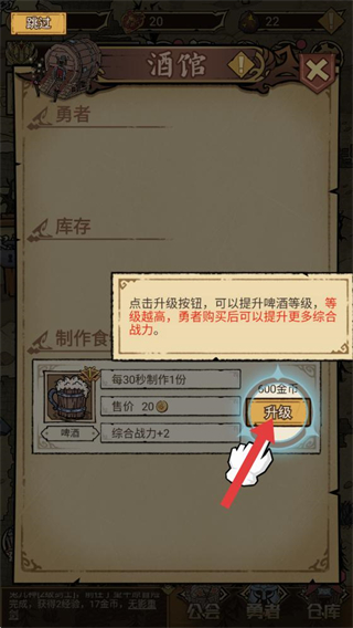 3、解鎖制作后,點擊升級按鈕可提升酒館等級,等級越高,勇者購買食物后獲得的綜合戰力加成越多。