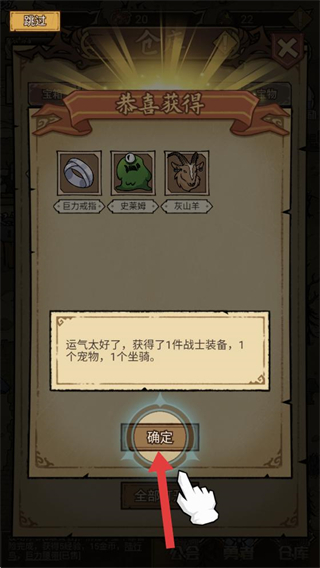 4、完成任務后可獲得獎勵,點擊確定即可領取這些道具,用于強化勇者隊伍。