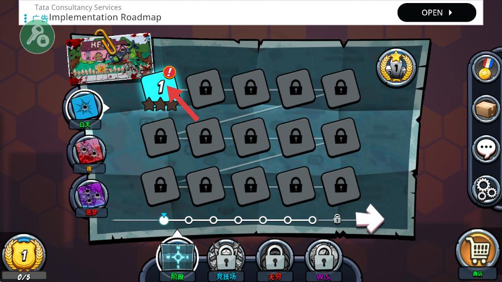 1、關卡界面中初始解鎖第1關,可選擇白天等場景模式,點擊關卡進入戰斗,后續關卡需逐步解鎖。