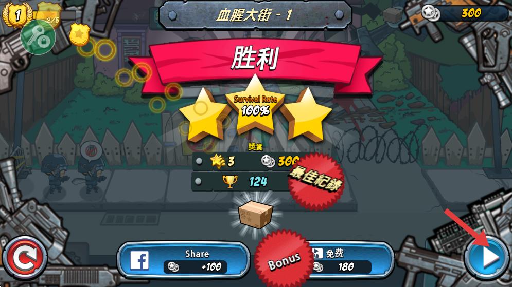 4、通關后獲得三星評價與獎勵,點擊箭頭按鈕可進入下一關,積累的資源可用于解鎖更強單位,提升防御能力。