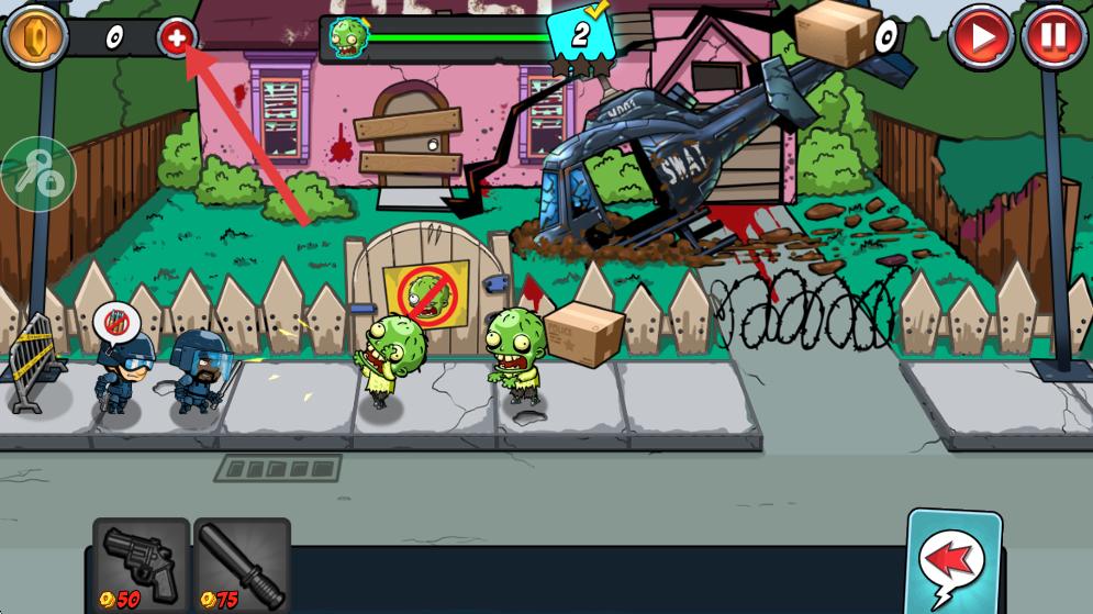 1、戰斗中消耗金幣部署單位如持槍、持棍角色,單位自動攻擊僵尸,可通過左上角按鈕補充資源,維持防御節奏。